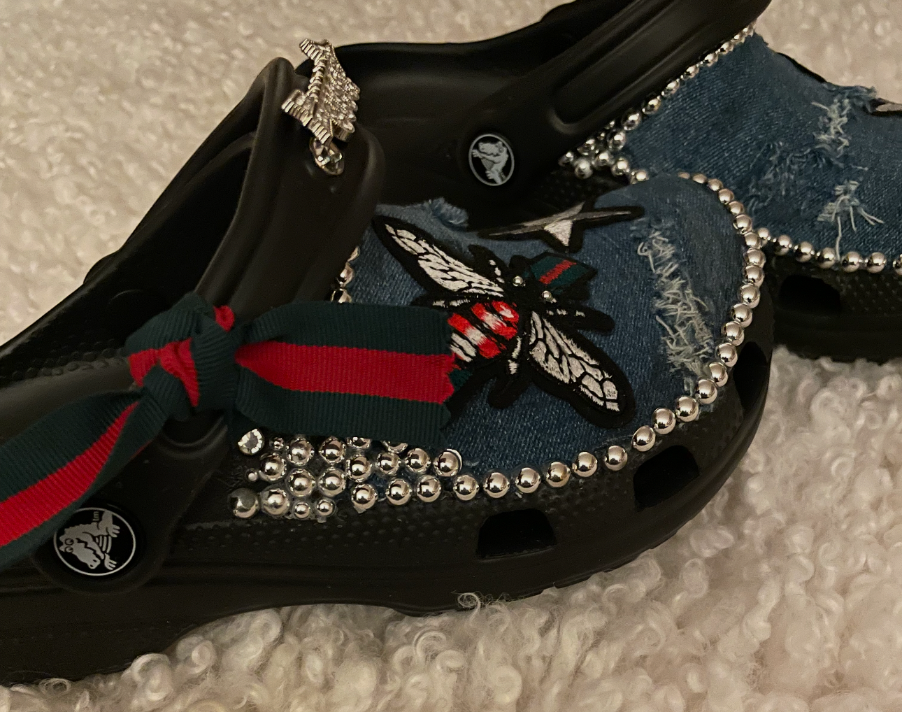 denim with handmade gucci bee design with silver studs typically takes 7-10 days